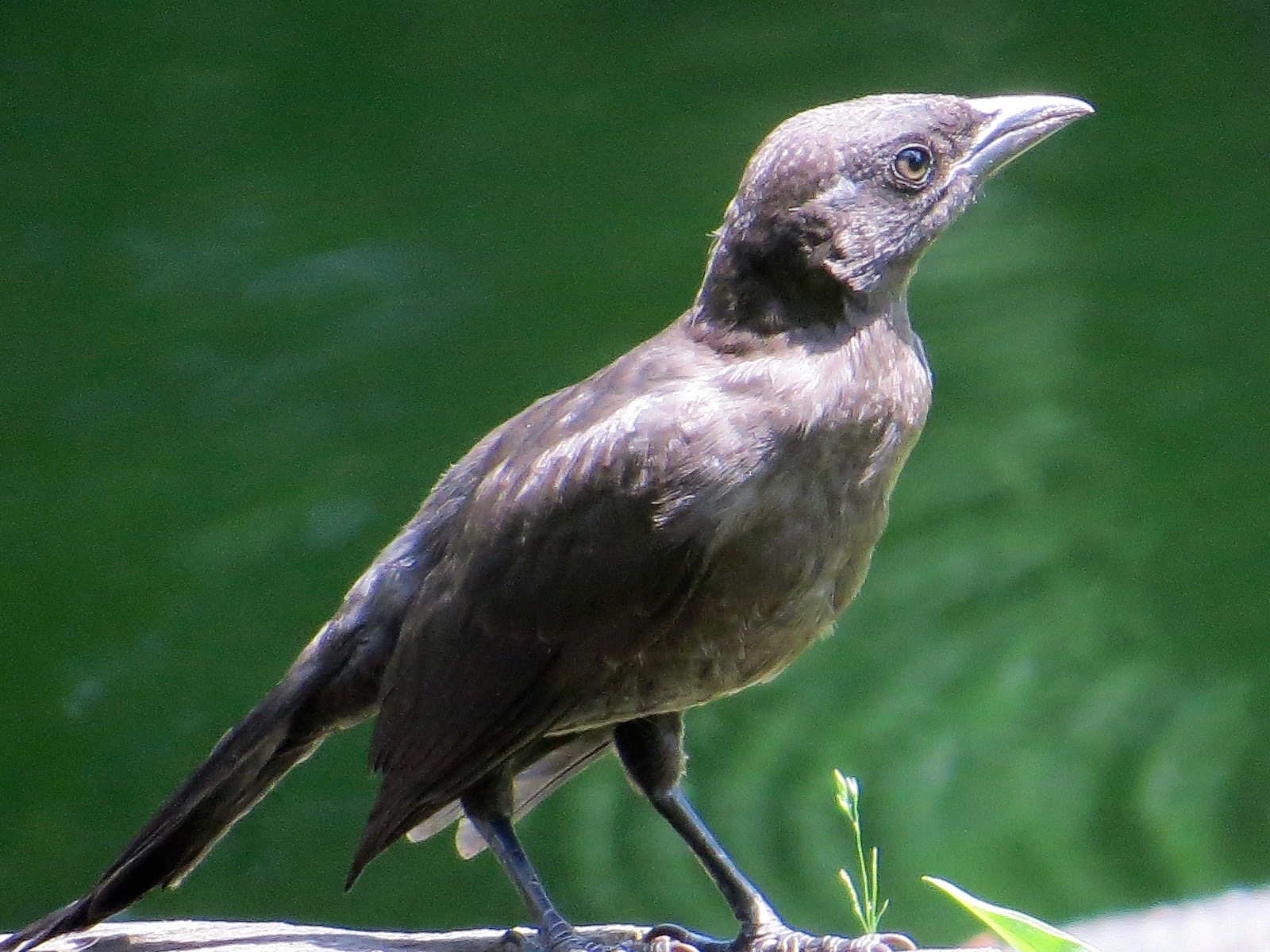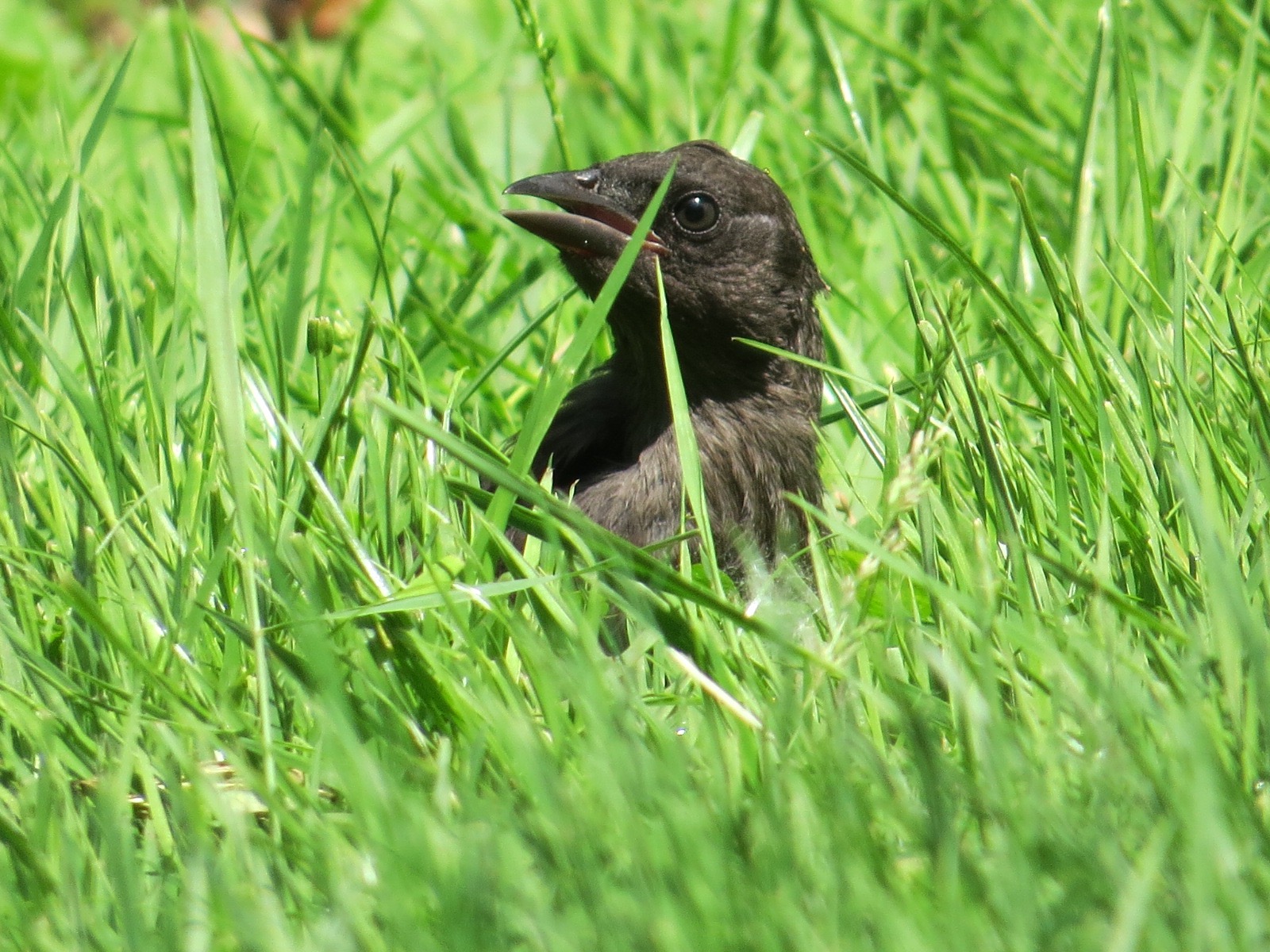 With their parents noisily thrashing in the leafy underbrush nearby, a trio of young Common Grackles (Quiscalus quiscula) were doing some of their own foraging in the grass.
