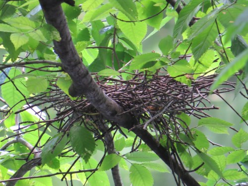 Green Heron, evidently abandoned. A rather loose collection, looking precarious, like a Mourning Dove’s, but larger and twiggier.
