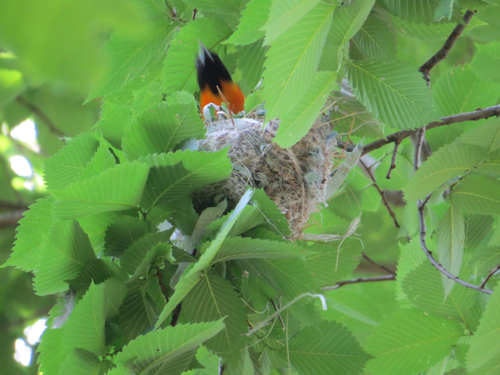 Oops! Baltimore Oriole male leaving nest after dropping off some chow.