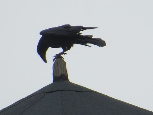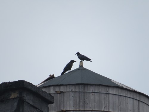 Yesterday noon, my second viewing of the clan. I’d just exited the 36th St. subway and was walking down 4th Avenue. I heard a strange noise above the infernal combustion cacophony of that grim roadway. The call was not one I was familiar with, yet it was corvid-ish and had my raven-senses jangling. Looking up and around, I saw nothing. But then I heard it again and spotted a big corvid flying over the school I was walking past. The bird turned around and flew back my way (hey, thanks!), giving me a good view of the tell-tale tail. Then it landed on one of the two water towers of the 39th Street building where I photographed the family of five last year.