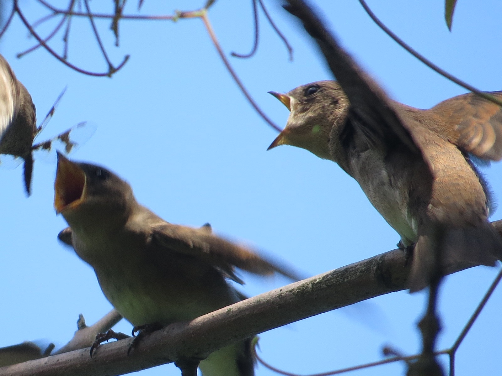 This of course assumes that our dragonfly will make it to old age (or September). Fast and highly maneuverable, dragonflies are great predators, but they are also predated. These Northern Rough-wing Swallow fledglings (Stelgidopteryx serripennis) are being served up with a female Eastern Amberwing (Perithemis tenera) by one of their parents.