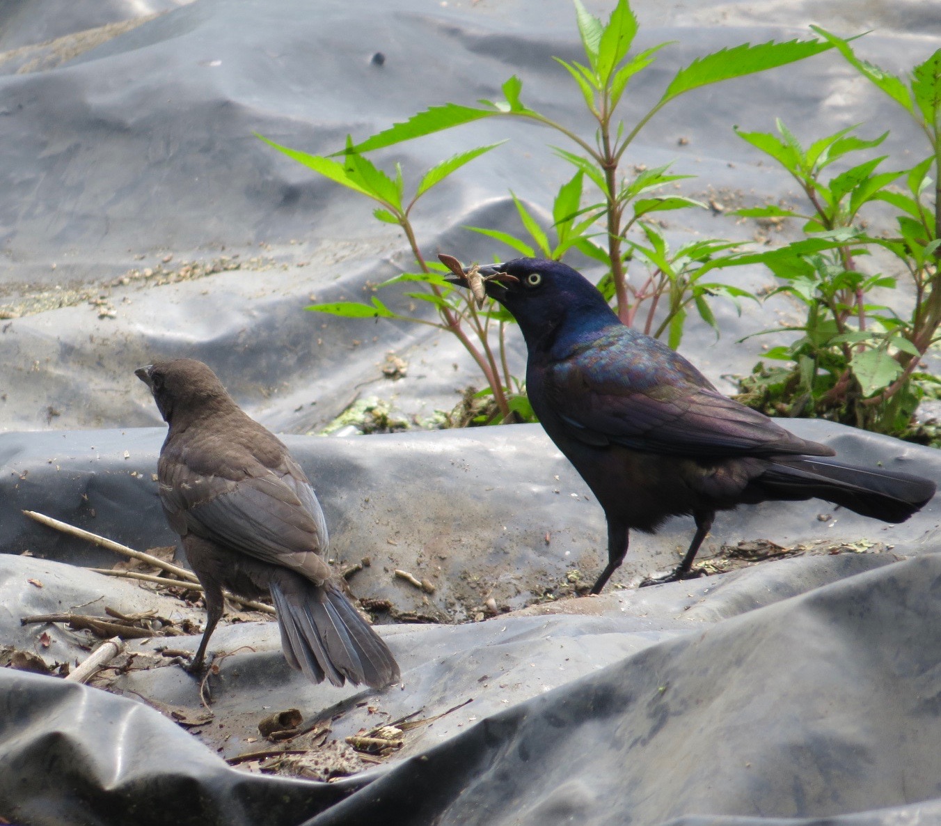 Another day, another Common Grackle youngster being served up a moth for lunch. Note how the young bird’s plumage lacks the iridescence of the mature bird, and is a drab gray rather than blue-black, except in the tail feathers.