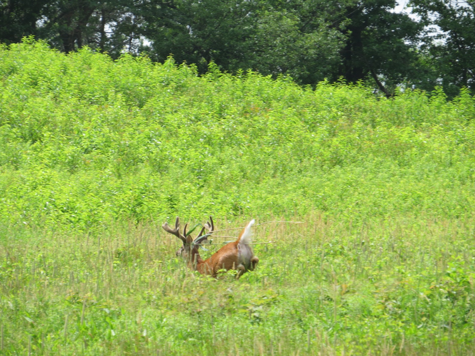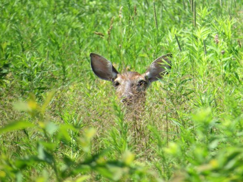 Yesterday, we ran into a few more there, including this one right out in the open on the other side of the pond. Another was bedded down in the meadow not ten feet from the path. He let us walk by, but when we returned, and our eyes met, he skedaddled.