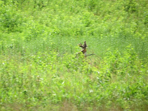 A tremendous crashing in the wetland thickets to our left brought forth this buck. He leaped into the meadow trailing phragmites from his rack. Note that the animal is tagged [#326?]; looks like this means he was given a vasectomy in an effort to cut Staten Island’s White-tailed Deer (Odocoileus virginianus) population.