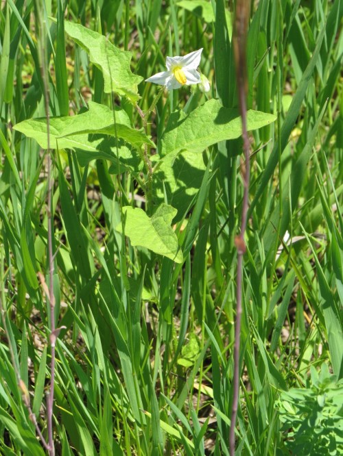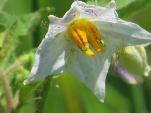 A closer look at the flower of what I think is Horse-nettle (Solanum carolinense), a delightfully weedy nightshade, shows the horn-like anthers that the native bees’ buzz shakes open.