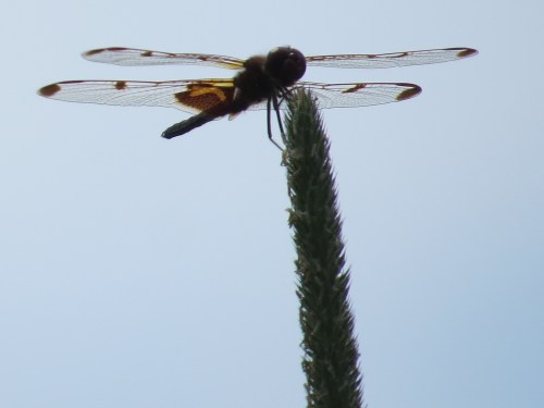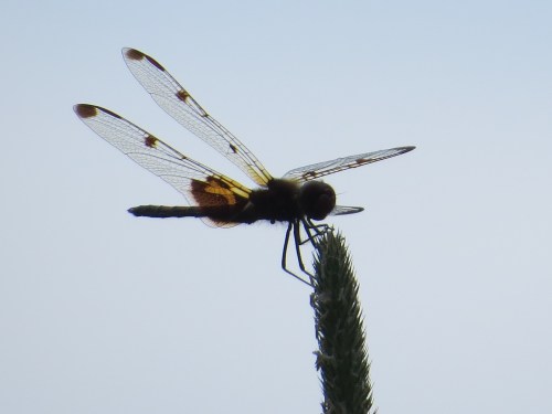 This one is actually fairly red, so feel free to curse this backlighting. A Calico Pennant (Celithemis elisa).