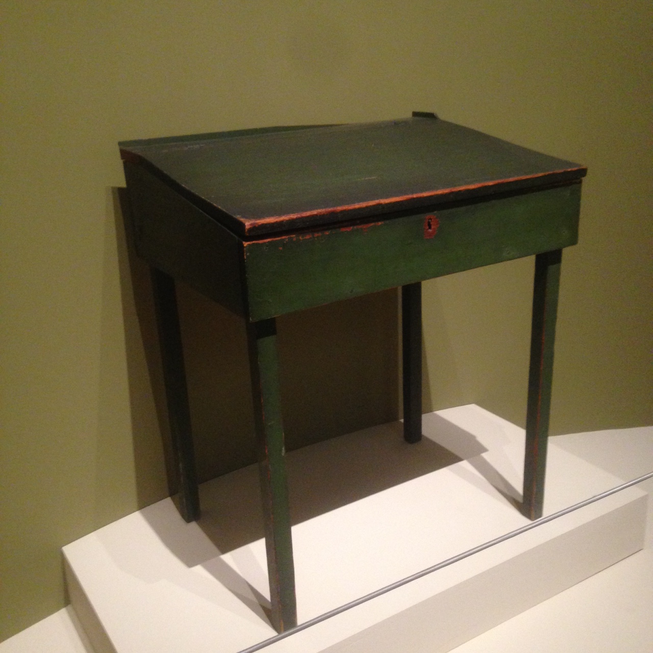 The words are the things here, but you can also see such stuff as his walking stick, incised by the inch as a handy reference; his desk, pictured above, of Shaker-like simplicity; his ruler, inscribed D.H.T.; samples of the famous Thoreau & Co. pencils, and a lovely blue display box they would have been sold from; and two of his herbarium sheets. Above all, the flowing hand of his writing across pages of notebooks. This liquid scrawl is really quite difficult to read now. But judging from the finely-chiseled clarity of a letter sent to him, it was probably difficult to read Thoreau’s handwriting in his own time. Yet the words make an admirable pattern, a trace of vitality. It scootles across the page.