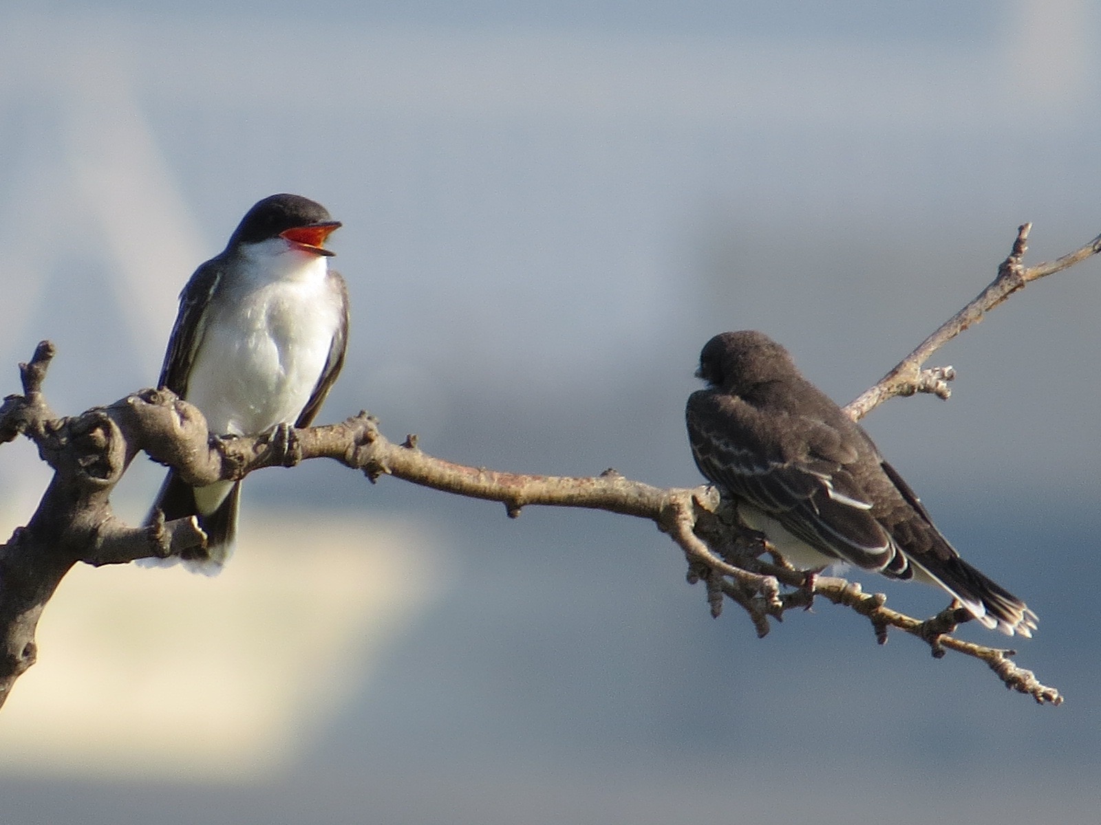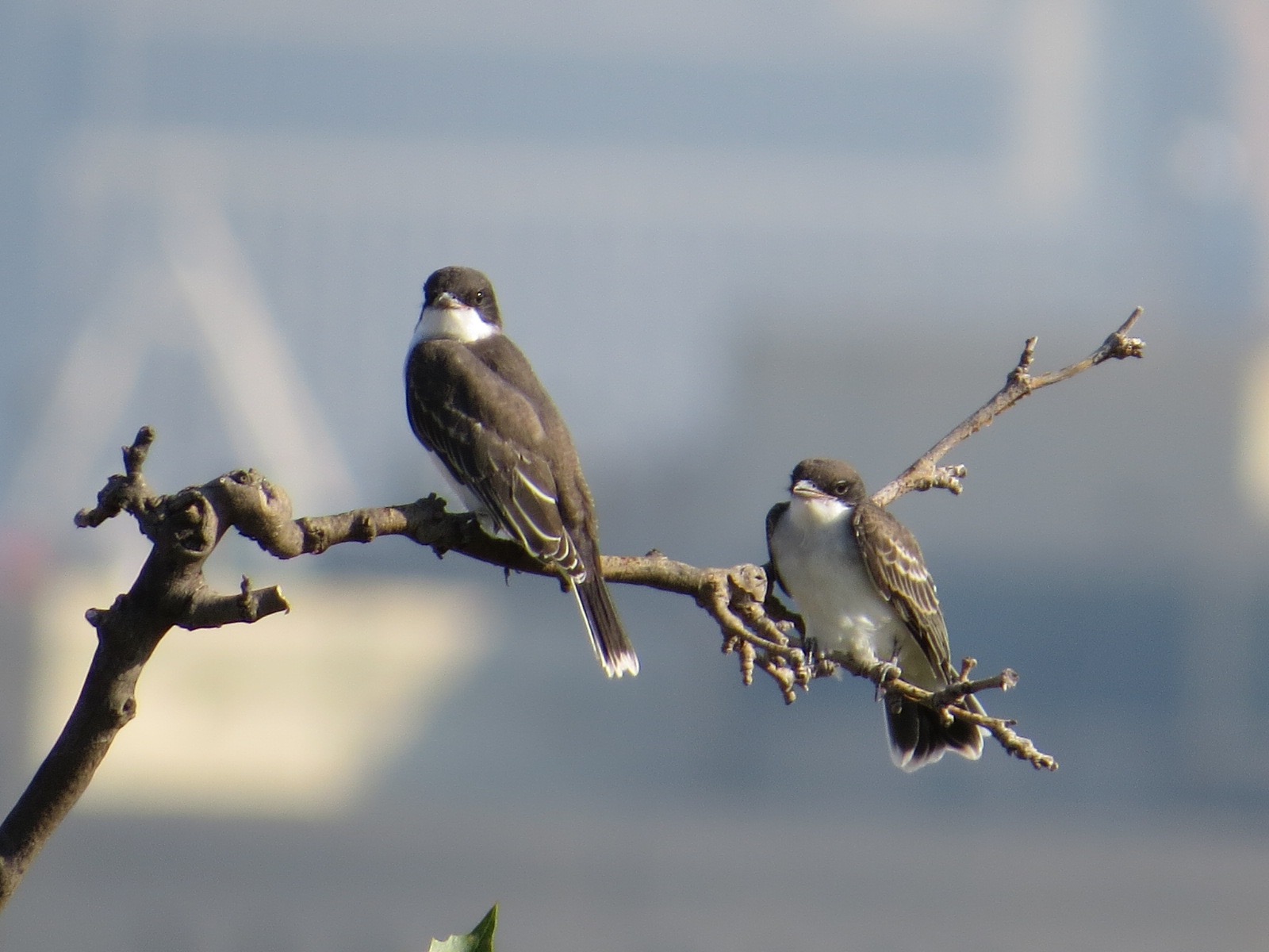 Kingbirds aren’t uncommon in parks, especially perched over water or meadows, but I don’t recall seeing one from the home windows. Above are the two fledglings. They chirped incessantly for food, their pink-red mouths marking their hungry maws. (This was on the plane tree across the street; the same branch has also hosted mating Kestrels.)
