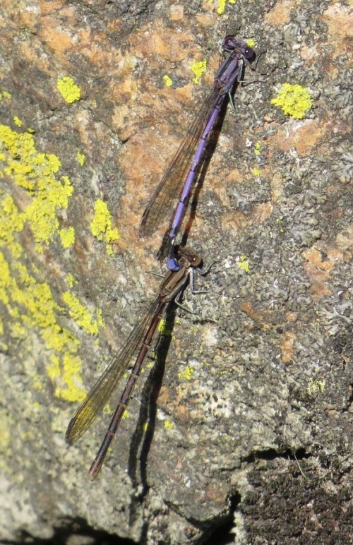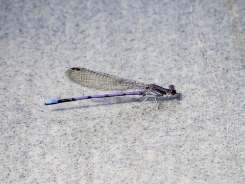 The Variable Dancer (Argia fumipennis) male is uniquely patterned with purple and blue. They are also called Violet Dancers.