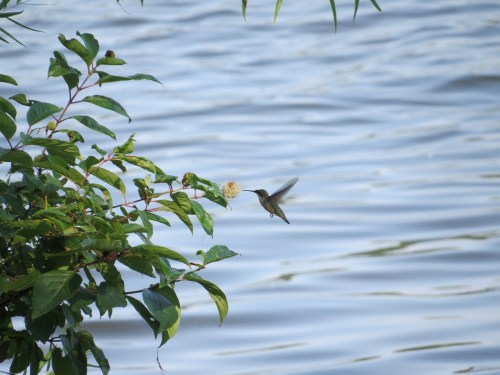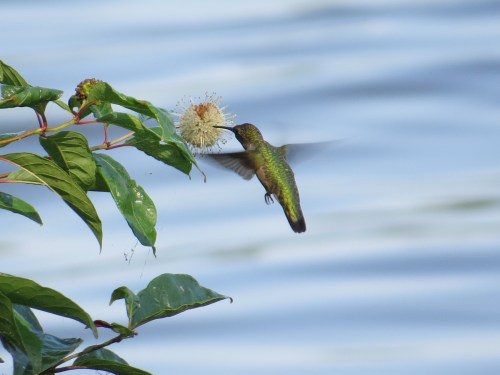 The deciduous shrub known as Buttonbush (Cephalanthus occidentalis) for its round flower heads is a fantastic pollinator-magnet. The plant loves its feet (roots) wet, and, as we discovered recently at the edge of Beaverdam Reservoir in Virginia, it also attracts hummingbirds.