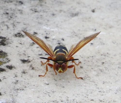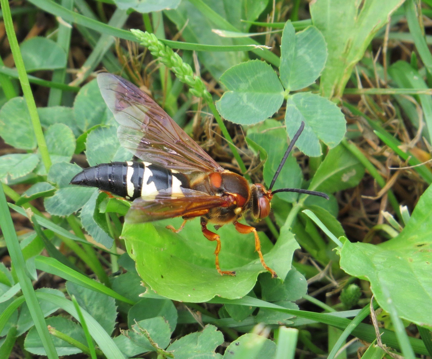 Every August you’re practically guaranteed to see poor soul someone jump and shout in terror when they see a Cicada Killer Wasp. Sphecius speciosus are big; over an inch, and tend to fly low when they’re not scouting out trees for cicadas to capture.
