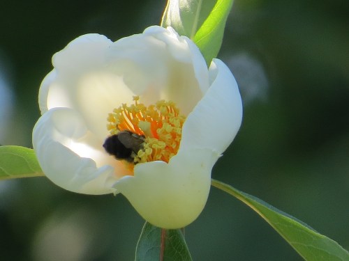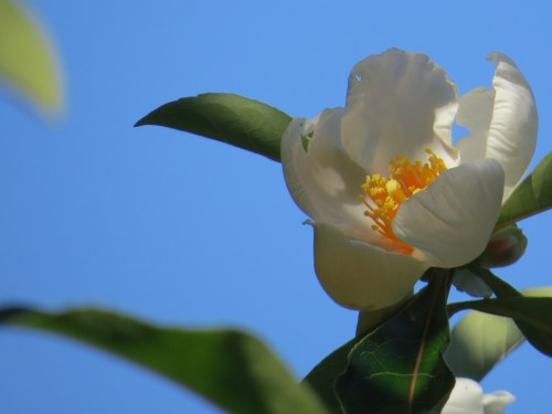 A late summer bloom. Isn’t the flower rather reminiscent of a camellia? In fact, the Franklin tree (Franklinia alatamaha) is in the same family, Theaceae, as the camellias, along with as its fellow natives Stewartia and Gordonia.. But this North American native is presumed extinct in the wild; it hasn’t been spotted since the early 19th century.