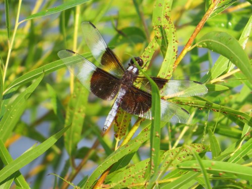 The clear/white/brown (it looks black in flight) patterning makes this one of the most distinctive of all our dragonflies. Even without a getting picture, or even a long view, I could take a mental description to the references and add it to my list (as I did recently with a pair of Halloween Pennants flying in tandem). The females lack the white bands, so she could potentially be confused with the Saddlebags even though she has the bases of all four of her wings stained brown.