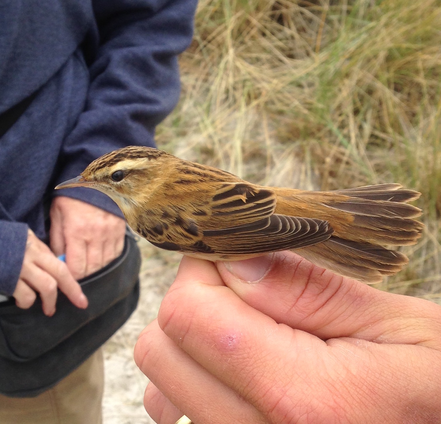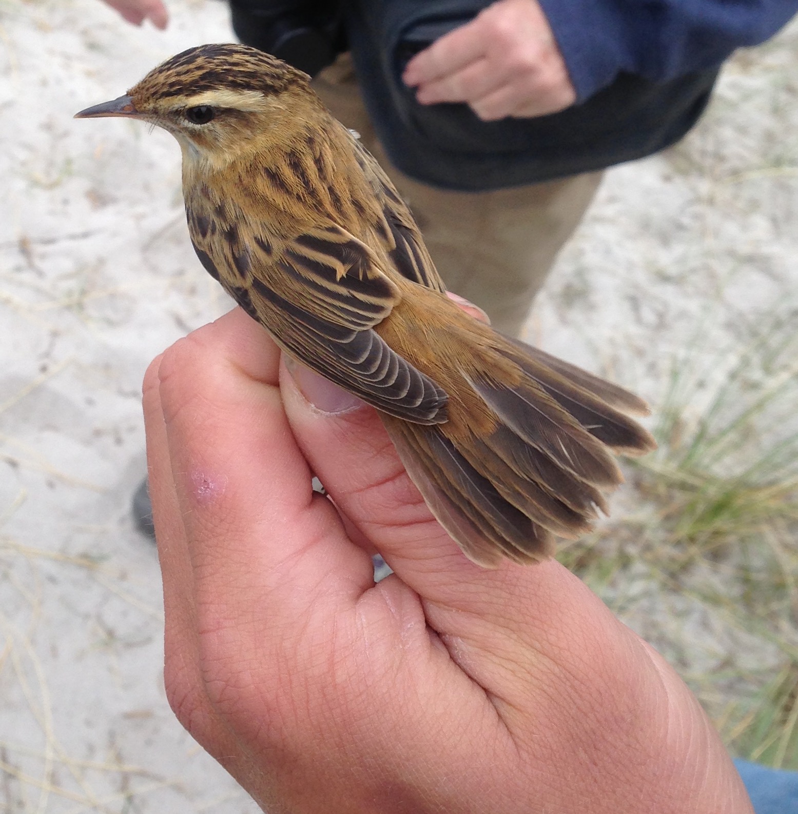 A Sedge Warbler (Acrocephalus schoenobaenus) after being ringed (or banded, as we would say) by members of the Falsterbo Fågelstation bird observatory. This little songbird is on its way to central/southern Africa, presuming it survives the gauntlet, including the Sahara, along the way.