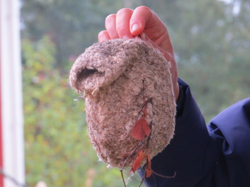 This was a coup de théâtre, though. It’s a nest of the Eurasian Penduline Tit (Remiz pendulinus), pungmes, woven together from the fluff of cattails. These birds are studied for their reproductive strategies; they obviously put a lot of effort into these nests — Karin demonstrated that the Swedes think they look like human male genitalia — but both males and females are sequentially polygamous and one or the other or sometimes both will abandon their nests, even with young inside.