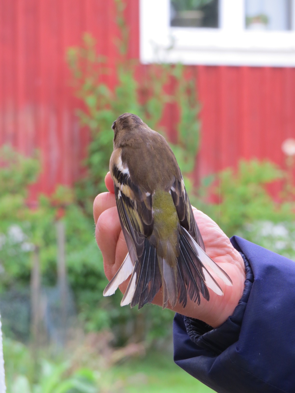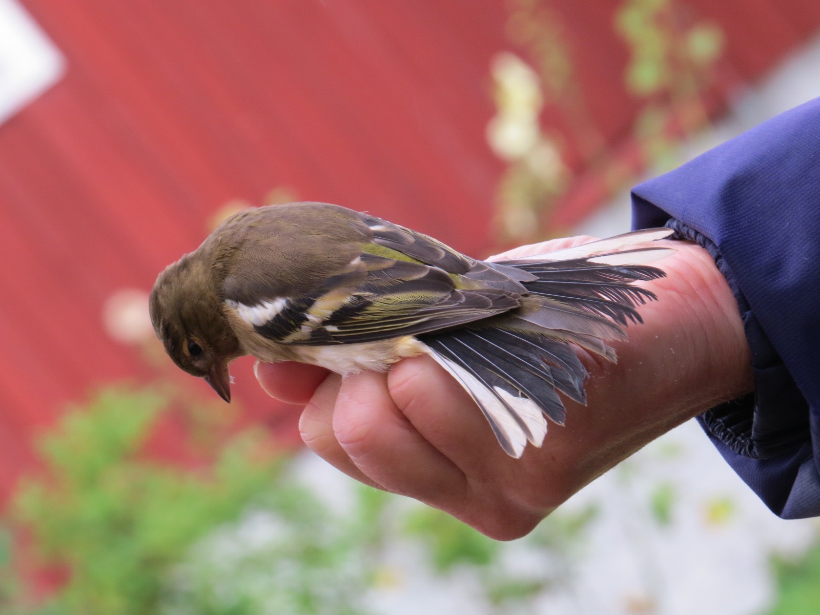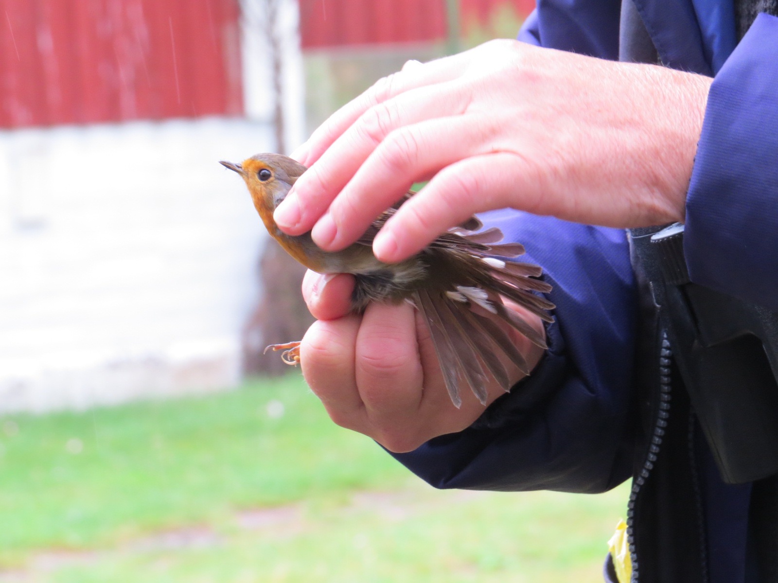 We attended a ringing demonstration at the Falsterbo Fågelstation. Karin, a volunteer at the observatory located at the Falsterbo fyr (lighthouse) also works there, reporting the weather every three hours. She has a molting Robin (Erithacus rubecula), or Rödhake in hand.