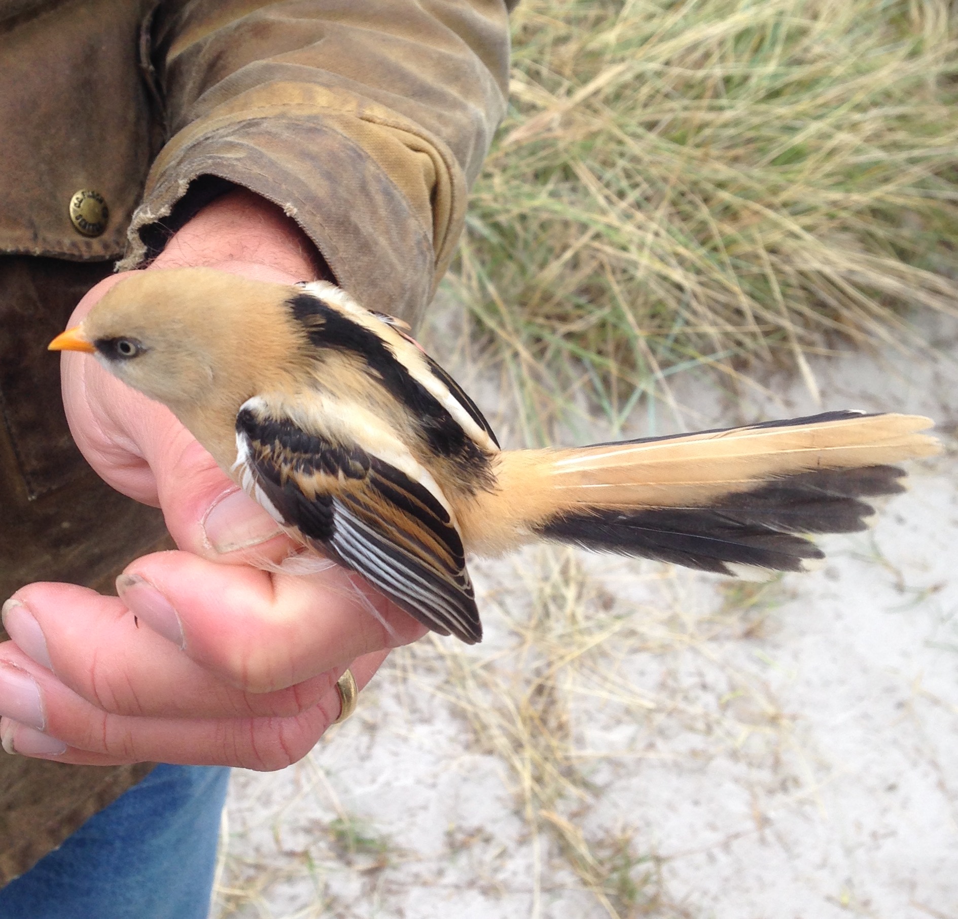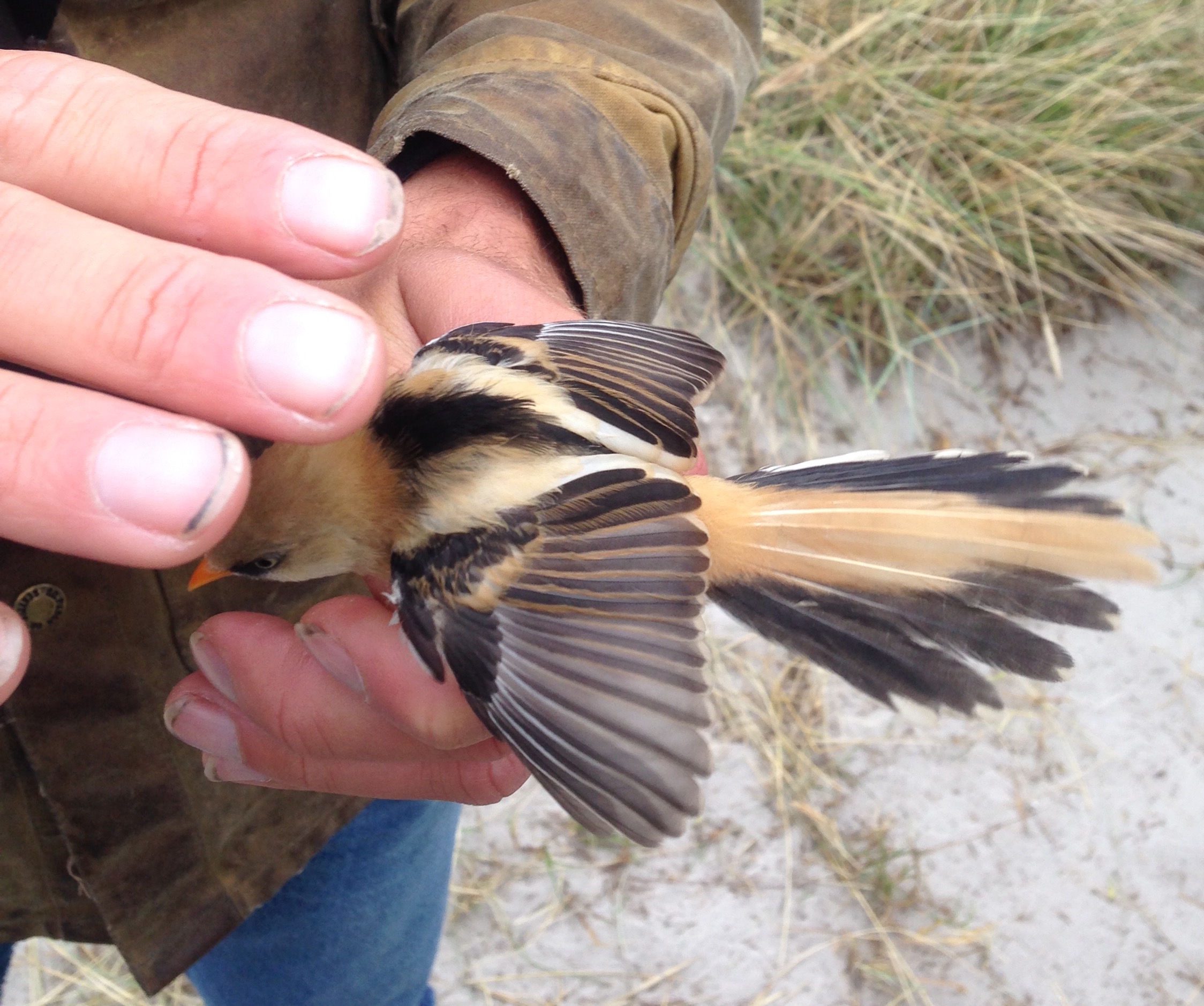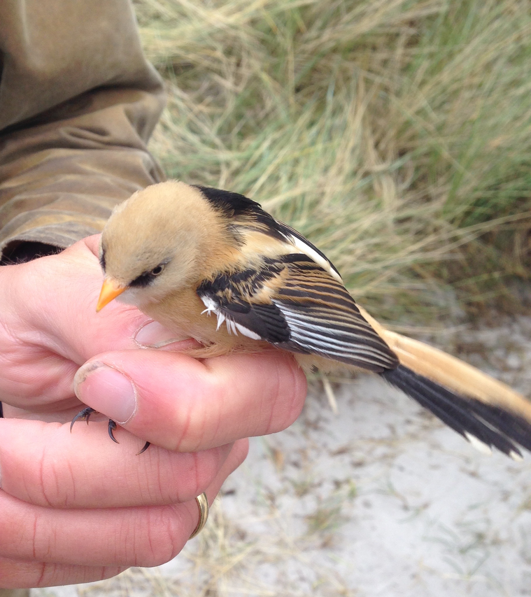 A juvenile male Bearded Reedling (Panurus biarmicus), known as skäggmes to the locals, at the Flommen banding station.