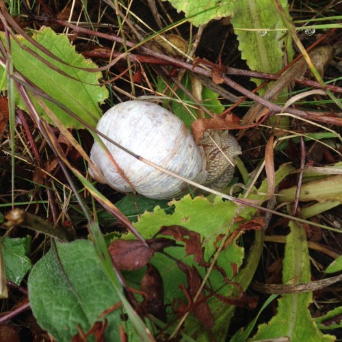 The famous escargot, Helix pomatia. Also known as Roman, Burgundy, or simply edible snail. Or, when in the Rome of the north, Snäckor. Introduced, running rampant in a slick way.