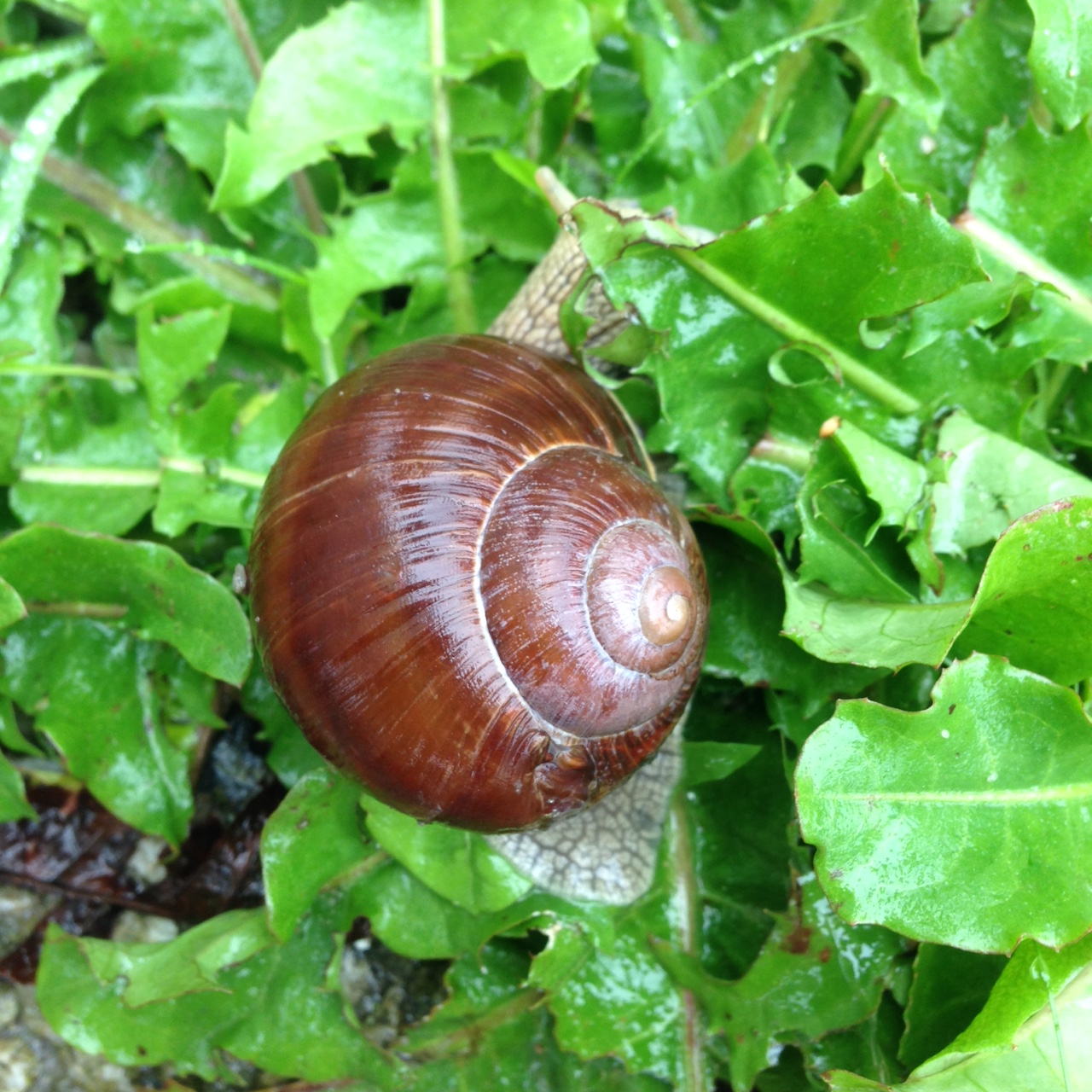 The famous escargot, Helix pomatia. Also known as Roman, Burgundy, or simply edible snail. Or, when in the Rome of the north, Snäckor. Introduced, running rampant in a slick way.