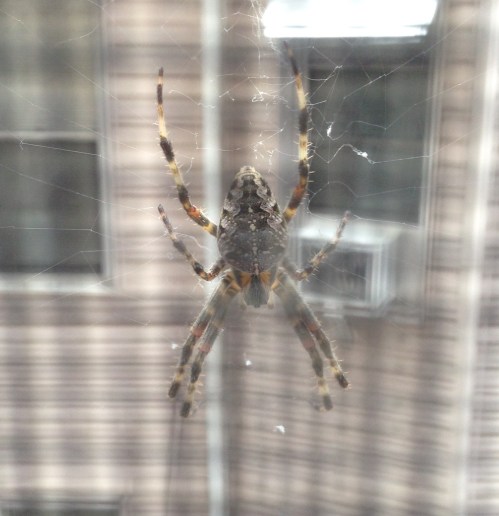 This 2″-long orb-weaver has been hanging out here since August. The web, quite tattered, is as high and wide as half the window. The animal is remarkably inactive, positioned in the center of web for most of the day, although she will quickly retreat into a nook in the storm-window frame when feeling shy.