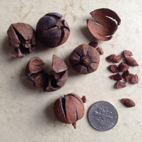 Franklinia is extinct in the wild, and all examples today are supposedly descendants of the ones the Bartarms collected in Georgia. Here’s one in bloom in the botanical parking lot.