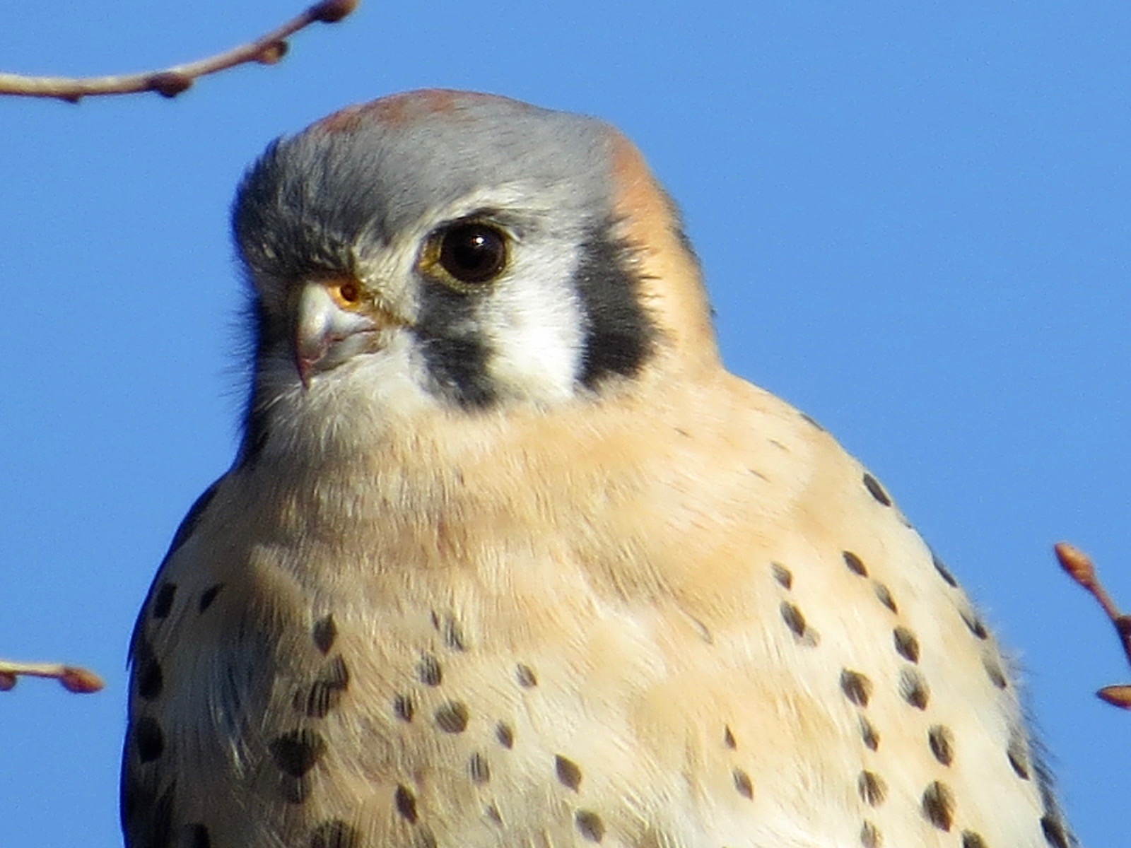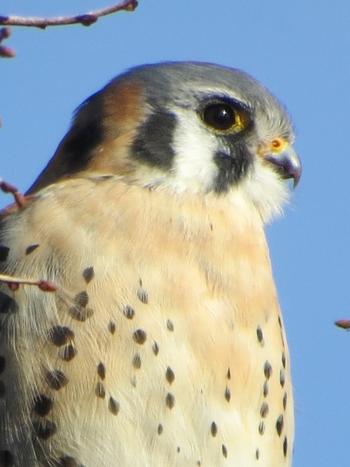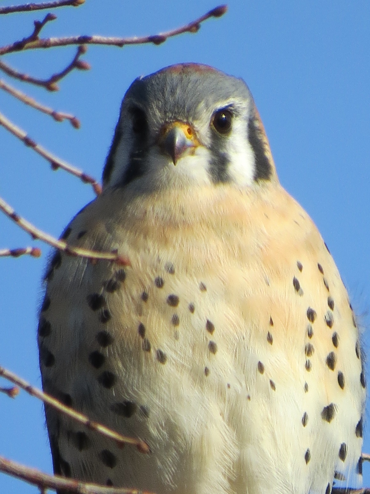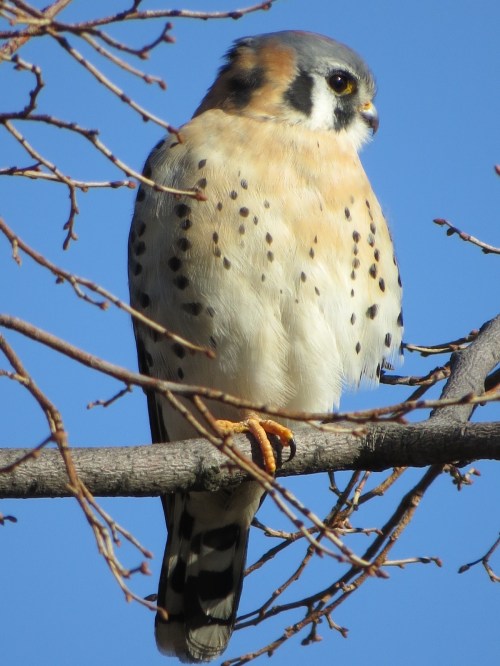 Yesterday, I heard a Kestrel while I was working. Looking outside, I saw a male, perhaps this same one (it’s about seven blocks to the tree), perched on an old TV antenna. HE made two dives down onto a roof. I think he may have captured something, because coming back up to the antenna, he bent his bill down to his toes a couple times, as if eating. But what was for lunch??? Then he flew off to yet another derelict TV antenna across the street, then up to some other type of antenna to perch for several minutes. I doubt anybody has a working TV antenna anymore (not to be confused with the dish antennas that also sprout from many a roof here). So they just jut there, accidental perches for colorful little falcons.
