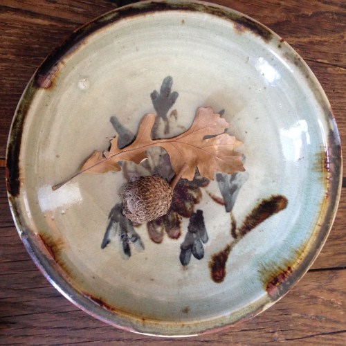 Quercus macrocarpa, the bur oak, is supposed to have the largest fruit (macro carpa) of all North American oaks. This acorn is in a 1.5″ long mossy cup. One of the species’ distinctive, pinched-waisted leaves on the plate, too.