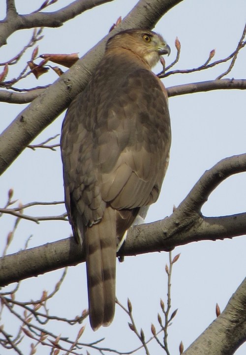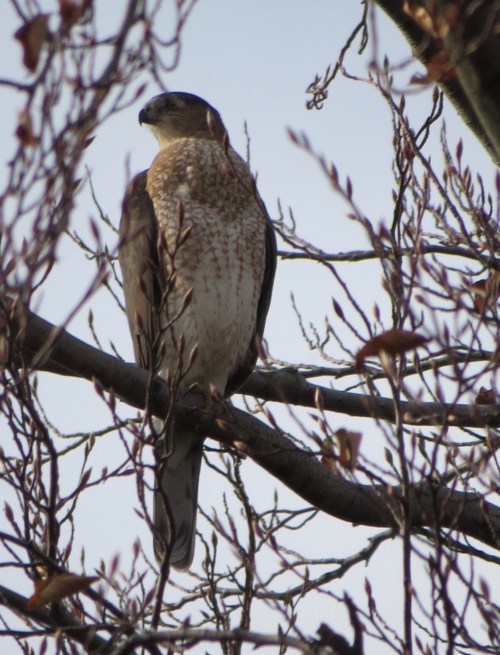 This Cooper’s Hawk (Accipiter cooperii), for instance. Most of the Coops I see are juveniles, browner with lots of white flecking on the back and having vertical markings on the front, not this red. This is an adult, or sub-adult. The eyes, for instance, aren’t quite the red of an adult (juveniles will have yellow eyes). A second year bird, perhaps?