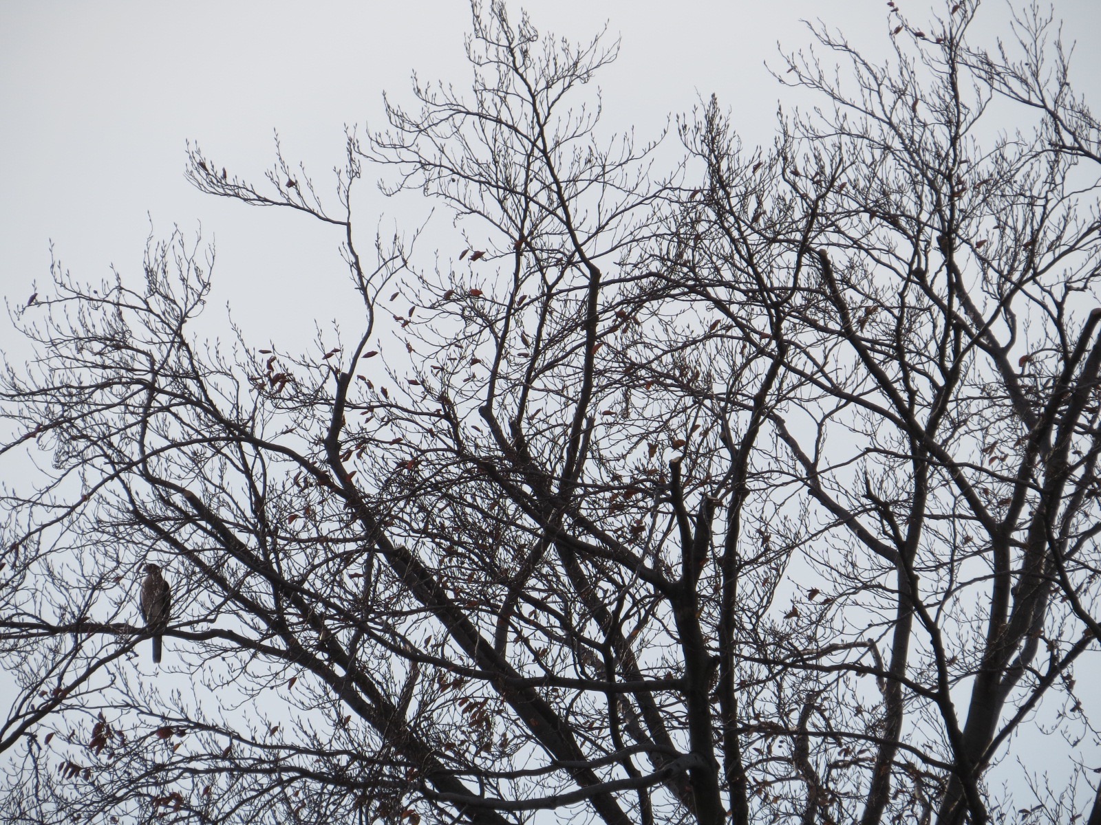 In winter, my eyes are always looking for the anomalies in trees. There are plastic bags and balloons, unfortunately, as well as the more welcome clumps of leaves from old squirrel dreys, and sagging Baltimore Oriole nests persisting past their usefulness (at least to birds), and big footballs of paper made by wasps. And then, sometimes, there are the silhouettes of raptors.