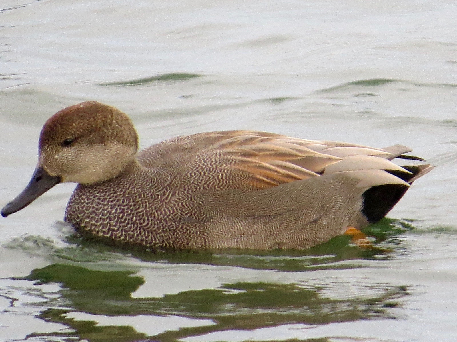 In flight, Gadwall show their white secondaries to advantage. They usually display a patch of them (the speculum) when not flying. But this drake is having none of that.