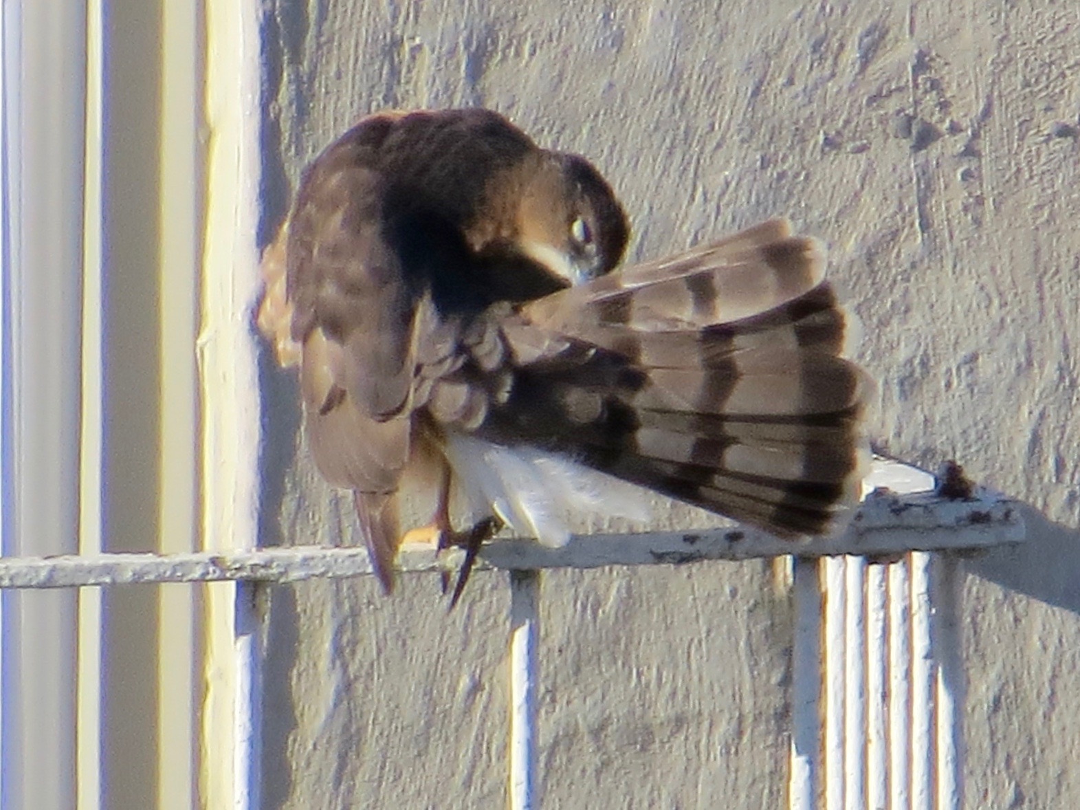 And we’re off to a good start for 2018: One Peregrine Monday. Two Peregrines Tuesday (one screaming bloody murder over a perched Red-tailed Hawk). Also yesterday, a male Kestrel perching on the fire-escape pictured above in the cold, cold morning, and a Cooper’s on the mid-day prowl.