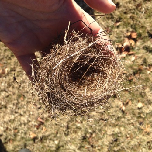 It’s made almost completely of woven grass. And a piece of elastic band? We immediately thought of Blue-Gray Gnatcatcher, one of our smallest species, but they, like that other tiny best builder, the Ruby-throated Hummingbird, use lichen and spider silk to bind and disguise their nests. Also it seems just slightly too large for a B-G Gnatcatcher.