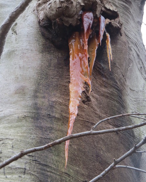 A great frozen waterfall of beech sap stalactiting from a massive specimen.