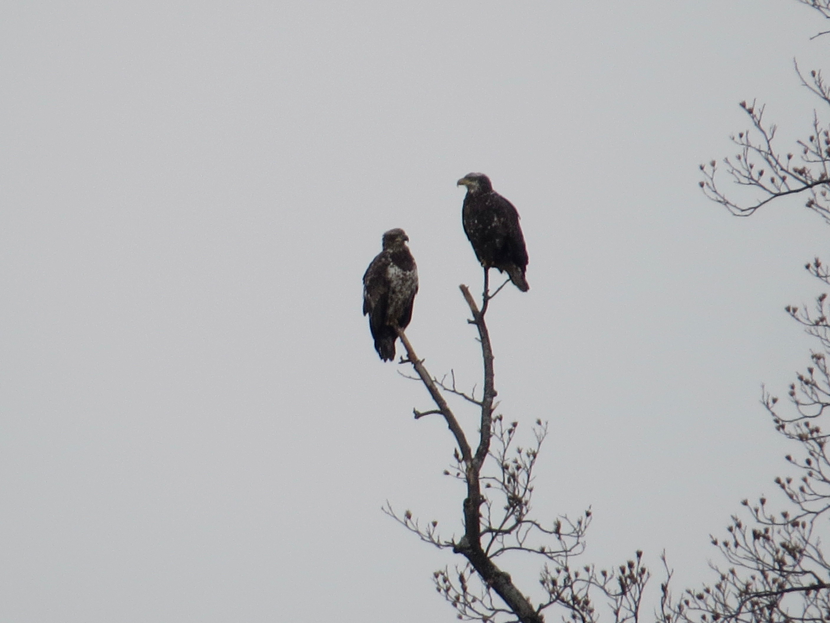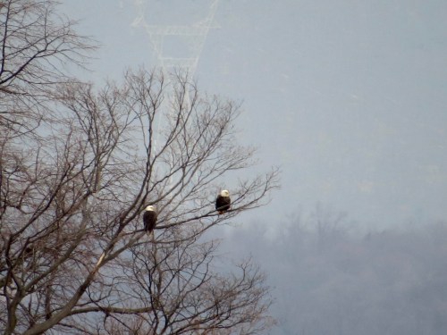 So how many eagles did we see all told? Lots. And of all ages. Those are third (left) and second (right) year birds in the first image. The old heads, with the distinctive white heads and tails, are five years old or older; younger ones are a mottled mix of plumages. As the pictures suggest, the birds clustering around the Hudson this time of year are not all that close most of the time. (We were much closer in Staten Island this summer.) The best views are usually of the birds in the air, sometimes passing near, and in the distance, their great regal bulks in trees and on the ice.