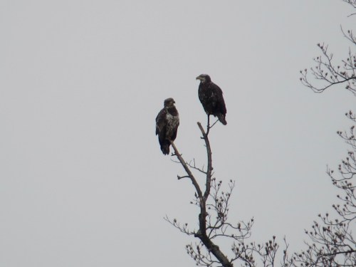 At Croton Point, on the capped landfill, there were ten visible simultaneously, four in air, the other six perched in two different locations. From the boat launch at the south end of the Metro North station, you could see four perched over the mouth of the Croton River (the small bay there was remarkable free of ice and waterfowl). Two flew away from that direction as we approached. Another was on the Croton Bay side, where earlier four could be seen.