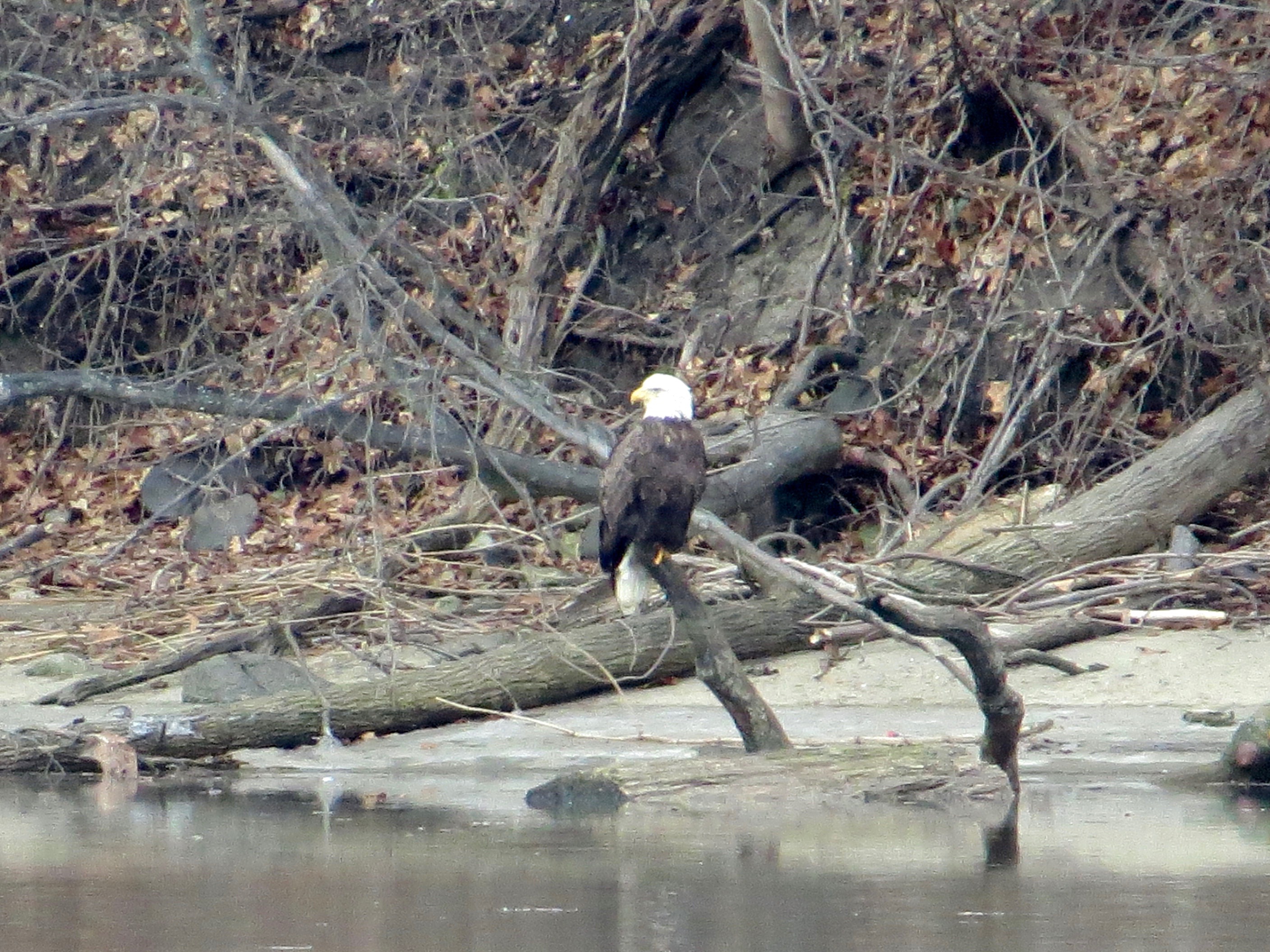 A recent scouting trip up the river to George’s Island Park and Croton Point Park, both on the east side of the river, had us losing count of eagles overhead, perched distantly, and standing on ice and shallows across the river. We counted eleven at the same time here. This is an imprecise census, though. The four that went over head, did they circle back? There was lots of motion among the perched birds, too.