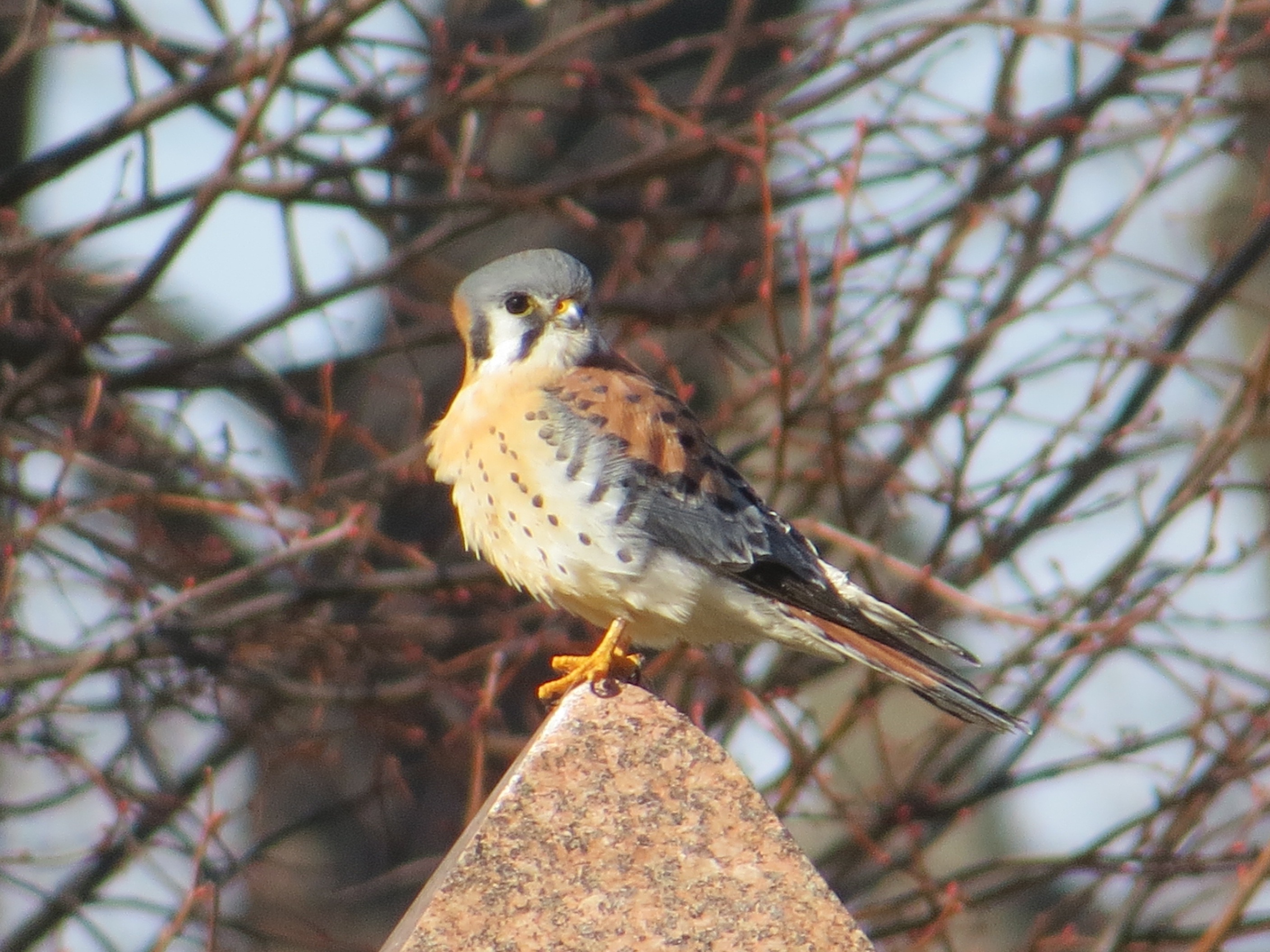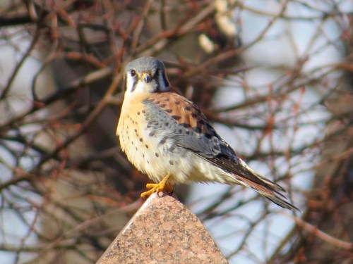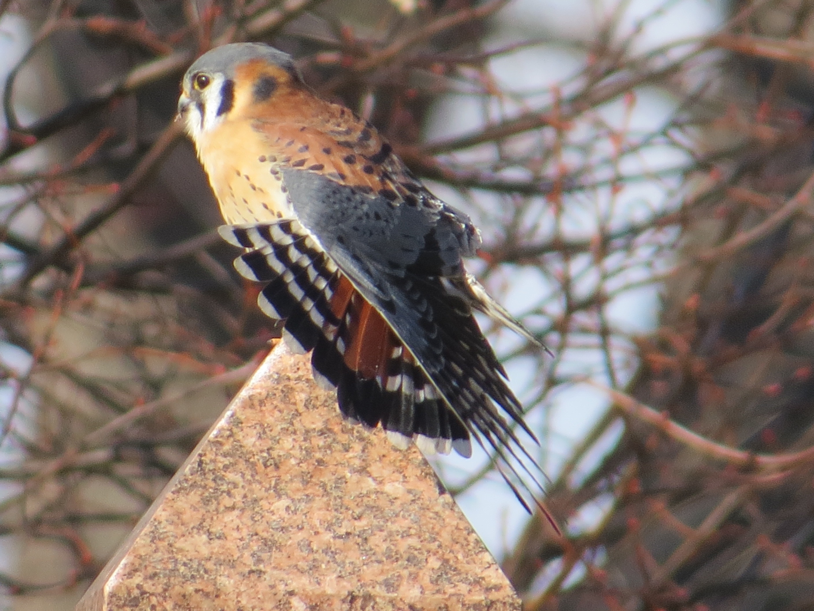 A male American Kestrel in Green-Wood. The wide black bar on the tail so nicely fanned below is a good way to ID the male in flight, since the blue wings can’t be seen from below.