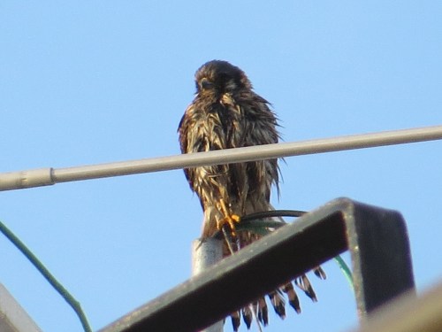 A pair on 4th Avenue, from last week. The female, on the upper left, is soaked to the feathers. I presume she has just bathed, hence also the fanned tail. Birds bathe most every day if they can, good for feather maintenance and cleaning, fighting mites, etc. Raptors, of course, can also be bloody. This was about an hour before sunset, which seemed late in the day to be wet.