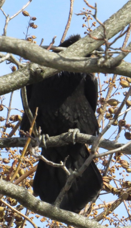 I’ve never gotten a very satisfactory picture of one of these big, noisy birds. That tail shape, though, is all raven. The bird was trying to break off a twig for a nest. Look at those toes!
