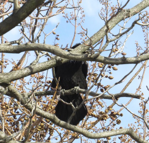 A couple and their dog were actually standing right underneath this tree when I came upon the scene. They were amazed at the bird’s size, as big as a hawk, much bigger than a crow.