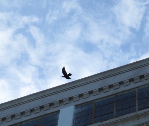 The bird flew, and we chatted. Then the other Raven flew overhead in the direction of the first.
