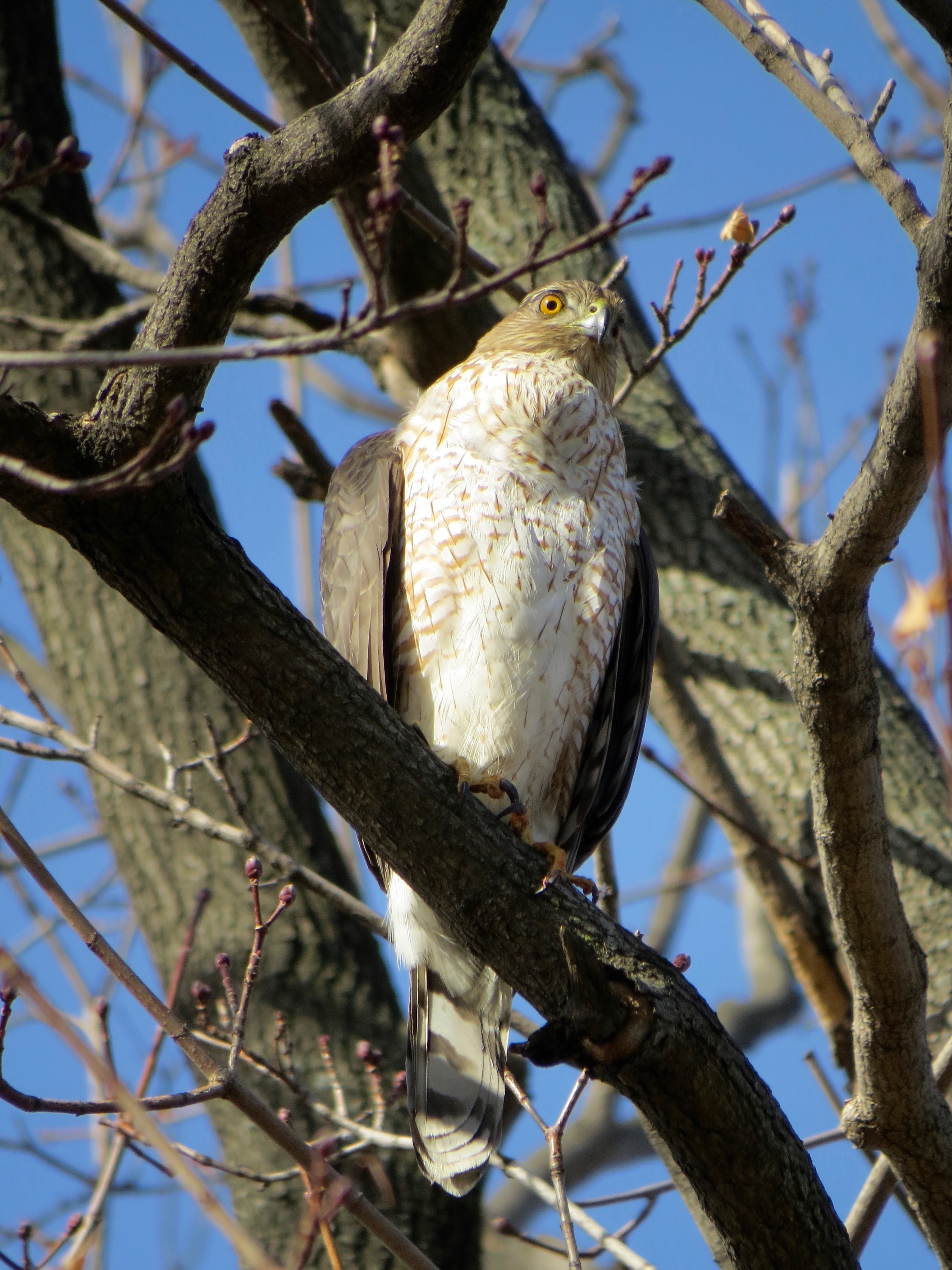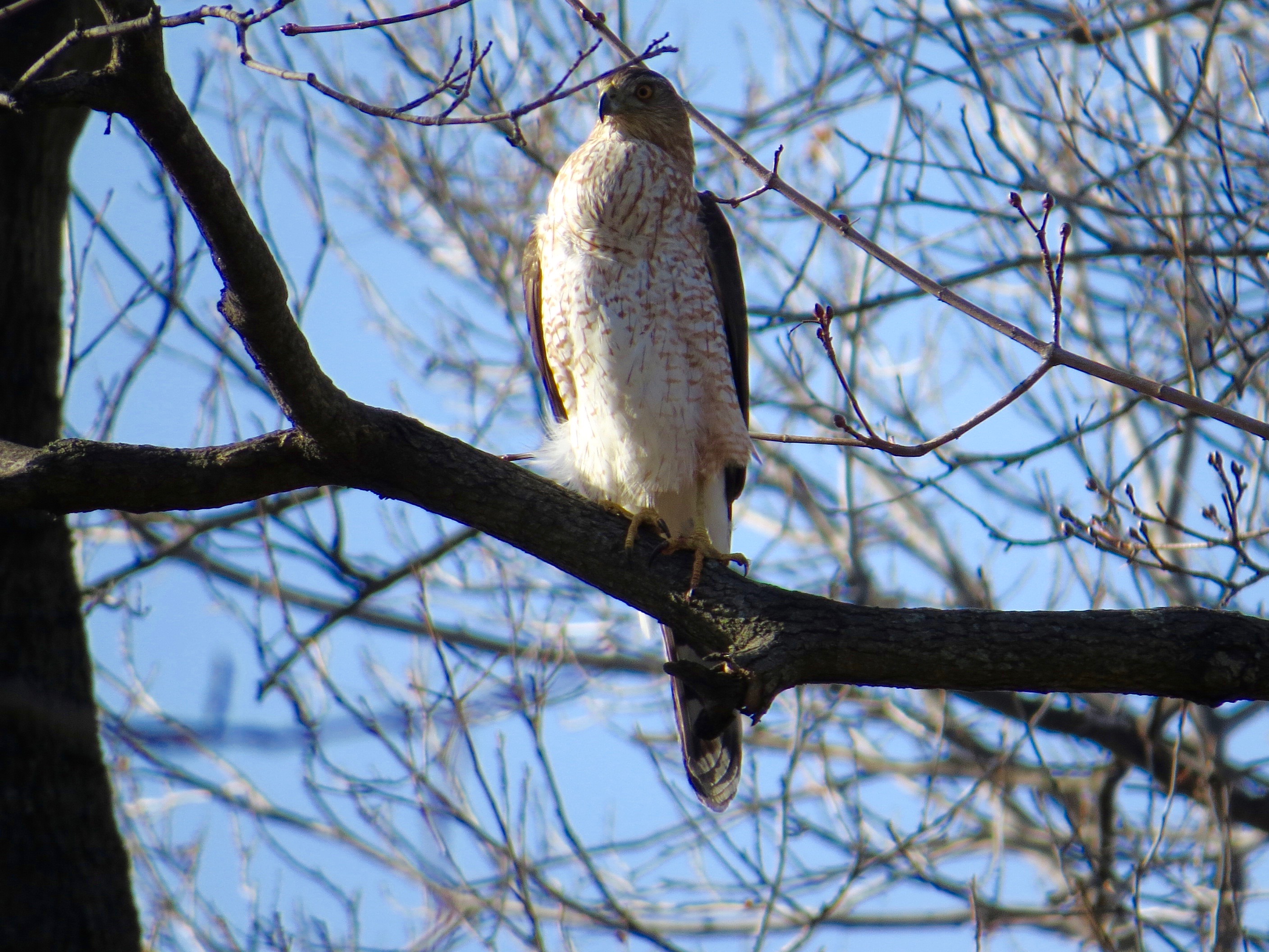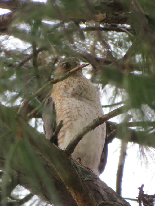 This bird, seen a few hours later perched out in the open, doesn’t have nearly as full of a crop. In fact, I didn’t even notice it until the bird took wing; then it was obvious, although not nearly the I-swallowed-an-apple of the first bird. A smaller morsel or just more digestion time? While I was observing this bird, another Cooper’s flew right overhead; I expected this one to respond, but neither seemed to notice each other (nor, curiously, did two Blue Jays briefly in this same tree).