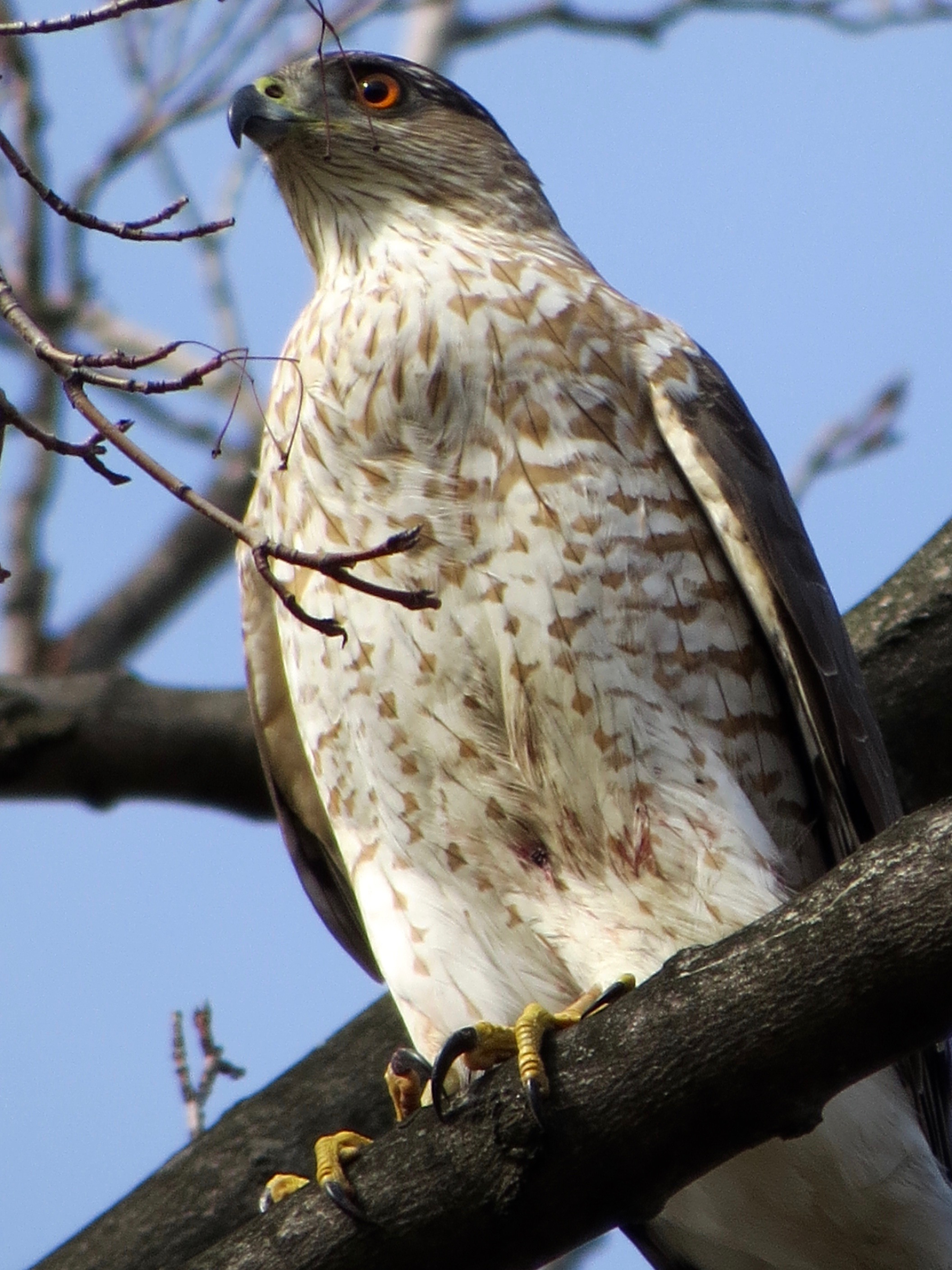 Note the flecks of blood on the feathers just above the talons. Also, compare the eye color of these birds. As Cooper’s age, their eyes turn from yellow to orange to red (most pronouncedly in the males).