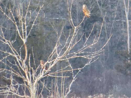 The light was going fast. That’s a Northern Harrier in the middle of the tree and a Short-eared Owl on the upper right.
