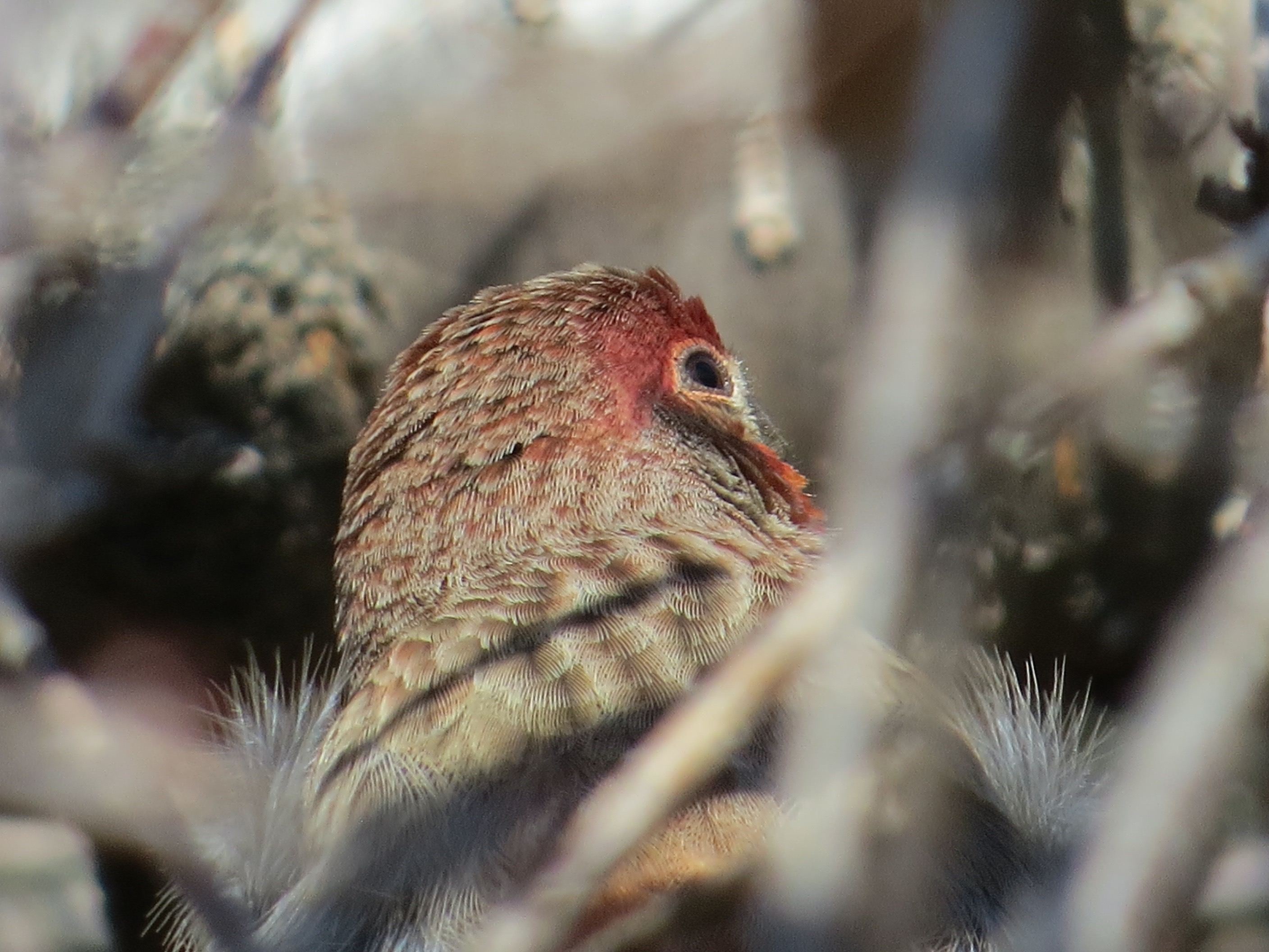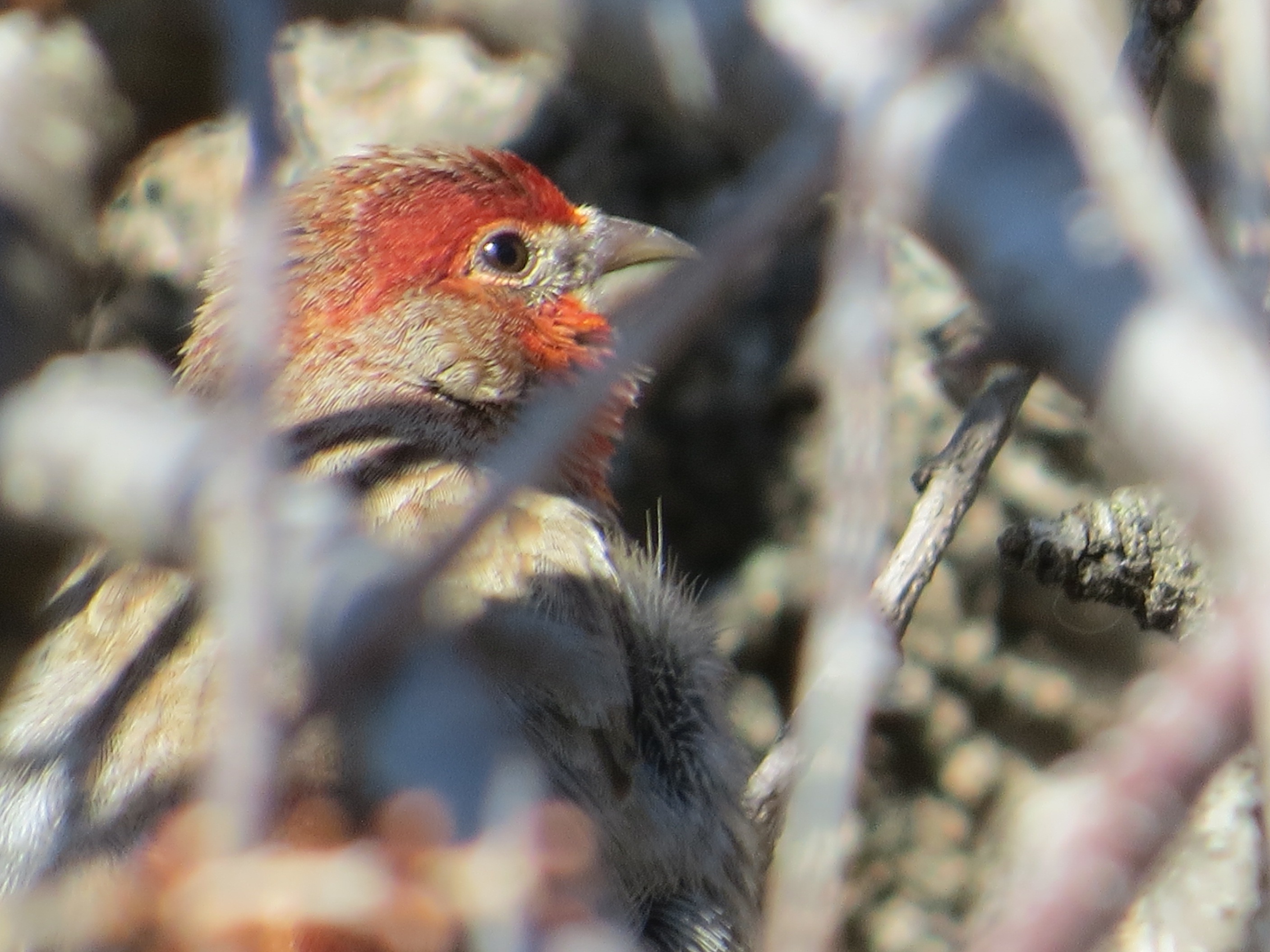 Deep in a thicket of weeping ornamental cherry in Green-Wood, this House Finch was singing like the madness of spring had already enlarged his gonads.