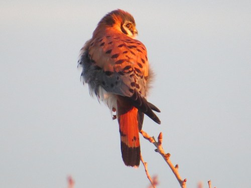Sunrise on the American Kestrel male this morning, a few minutes before he and the female mated on their favorite roof-top pipe.