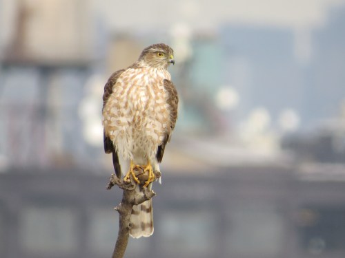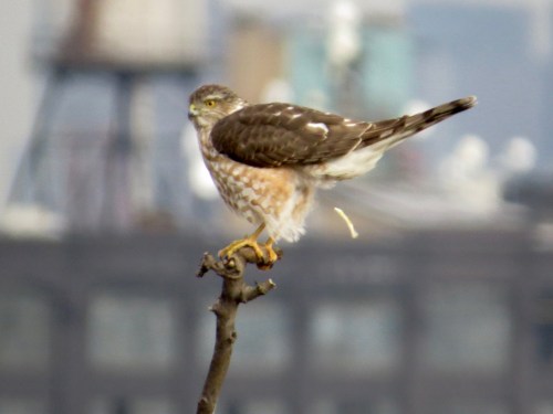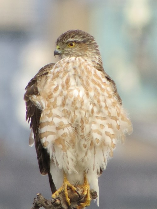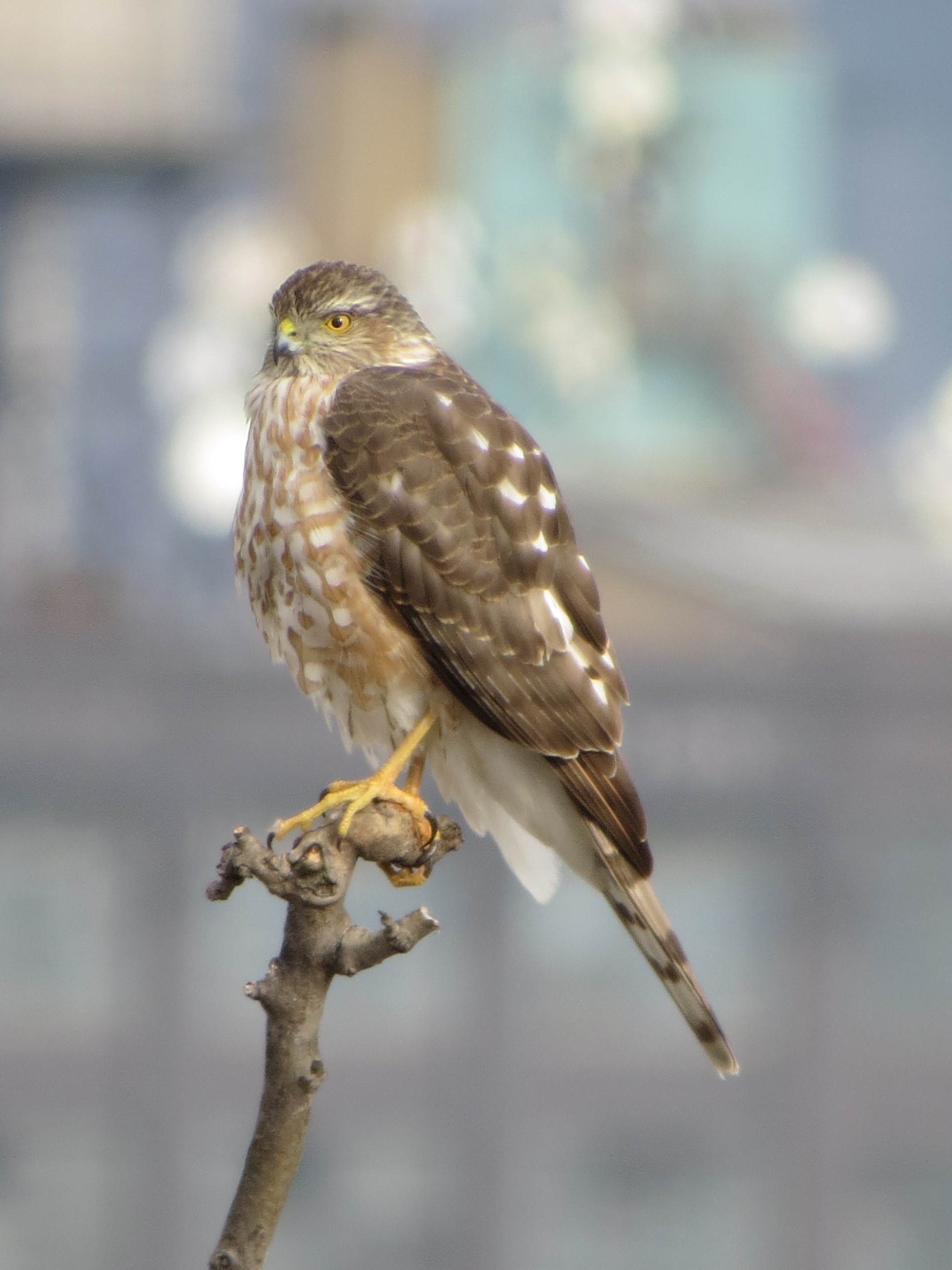 This common name, “Sharp-shinned” isn’t in the least helpful unless you have a bird in hand. (And with those talons, look out!) The “striatus” in the binomial means streaked.