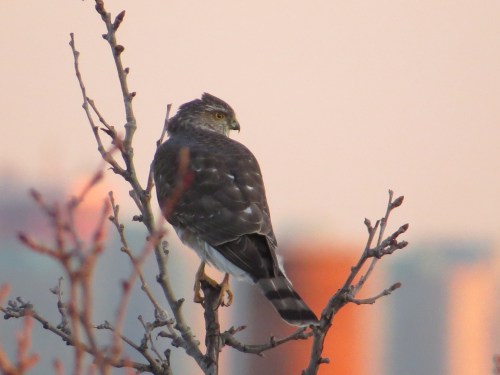 As I was preparing to head out the door last Sunday, the dawn of DST, I glanced out the window occasionally to see if the Kestrels would show up at the crack of dawn. They don’t set their clocks forward, after all. A bird whooshed into the London Plain across the street and hop-skipped-flew up to a perch, its back to me.