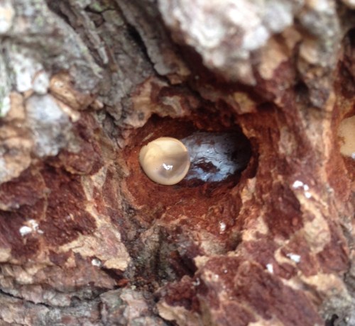 These holes are chiseled out by, in our parts, the Yellow-bellied Sapsucker (Sphyrapicus varius), who drinks the sugary sap and snaps up any insects also attracted to the sweet stuff.
