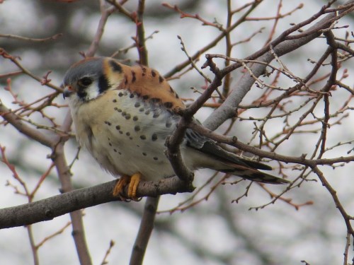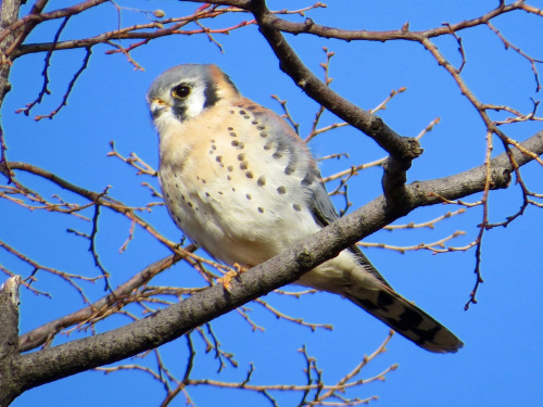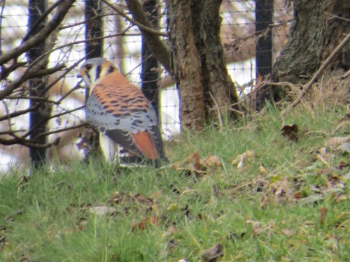 If I may assume for a moment: he likes this tree because it gives him an almost eye-level view of the upslope fence and bushes against the fence that always seem to harbor some House Sparrows. He made a sortie while I watched. I don’t recall seeing one of these little falcons on the ground before. He looks huge here, but of course isn’t.